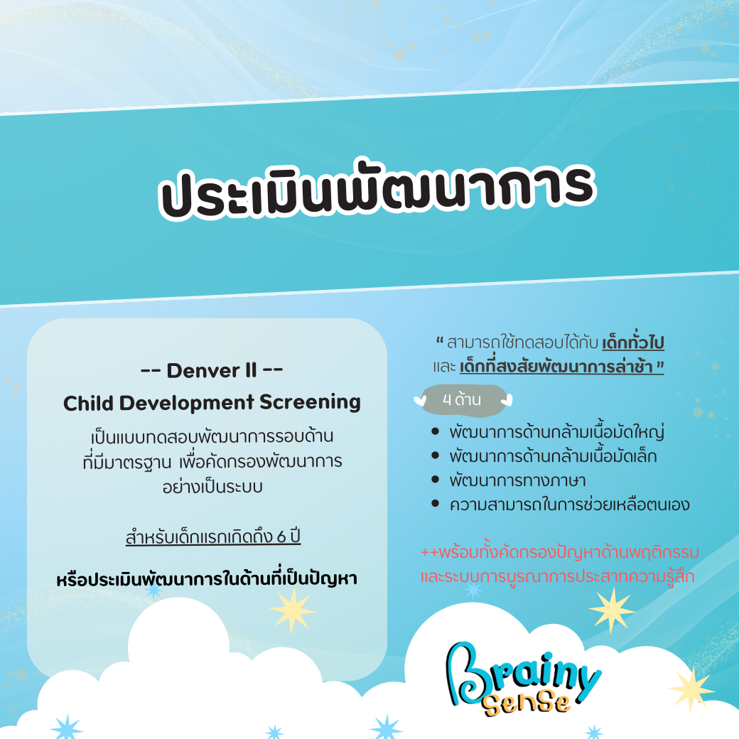 ประเมินพัฒนาการตามช่วงอายุด้วยแบบประเมินมาตรฐานสากล Denver II Child Development Screening และประเมินพัฒนาการในเรื่องที่เป็นปัญหา เพื่อให้ทราบถึงพัฒนาการของลูกเมื่อเทียบกับเด็กวัยเดียวกัน พร้อมรับบริการให้คำปรึกษาแนวทางการส่งเสริมพัฒนาการตามวัย